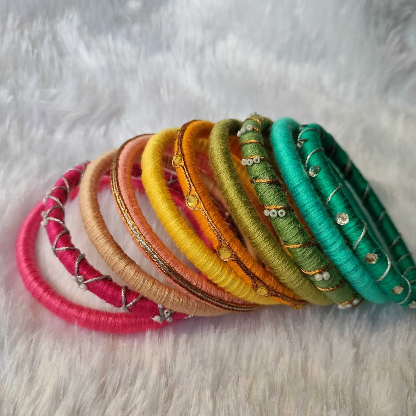 Set of 10 Carefully crafted Cotton thread bangles, which will enhance your traditional look.